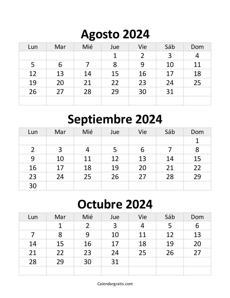 Calendario agosto septiembre y octubre 2024 para imprimir
