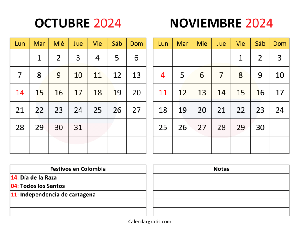 Disfruta de nuestros calendarios de octubre y noviembre 2024, especialmente adaptados para Colombia. Descarga gratis estas imágenes y organiza tus días con facilidad y eficacia.